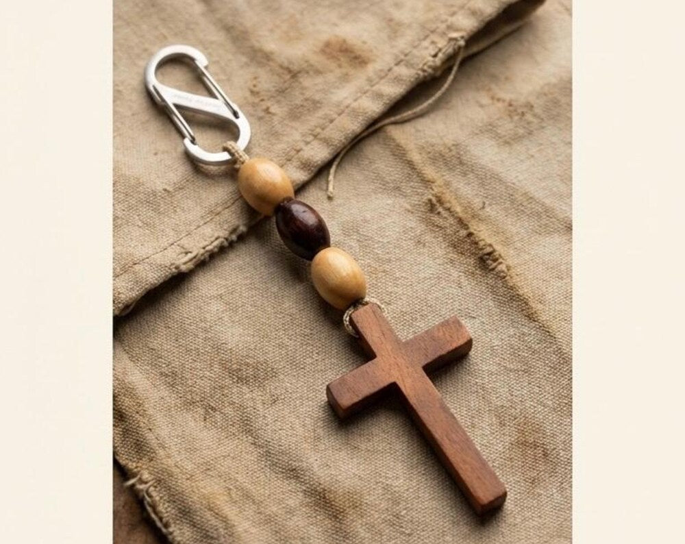 Men's Antique Gold Finish Wooden Cross Paracord Keychain